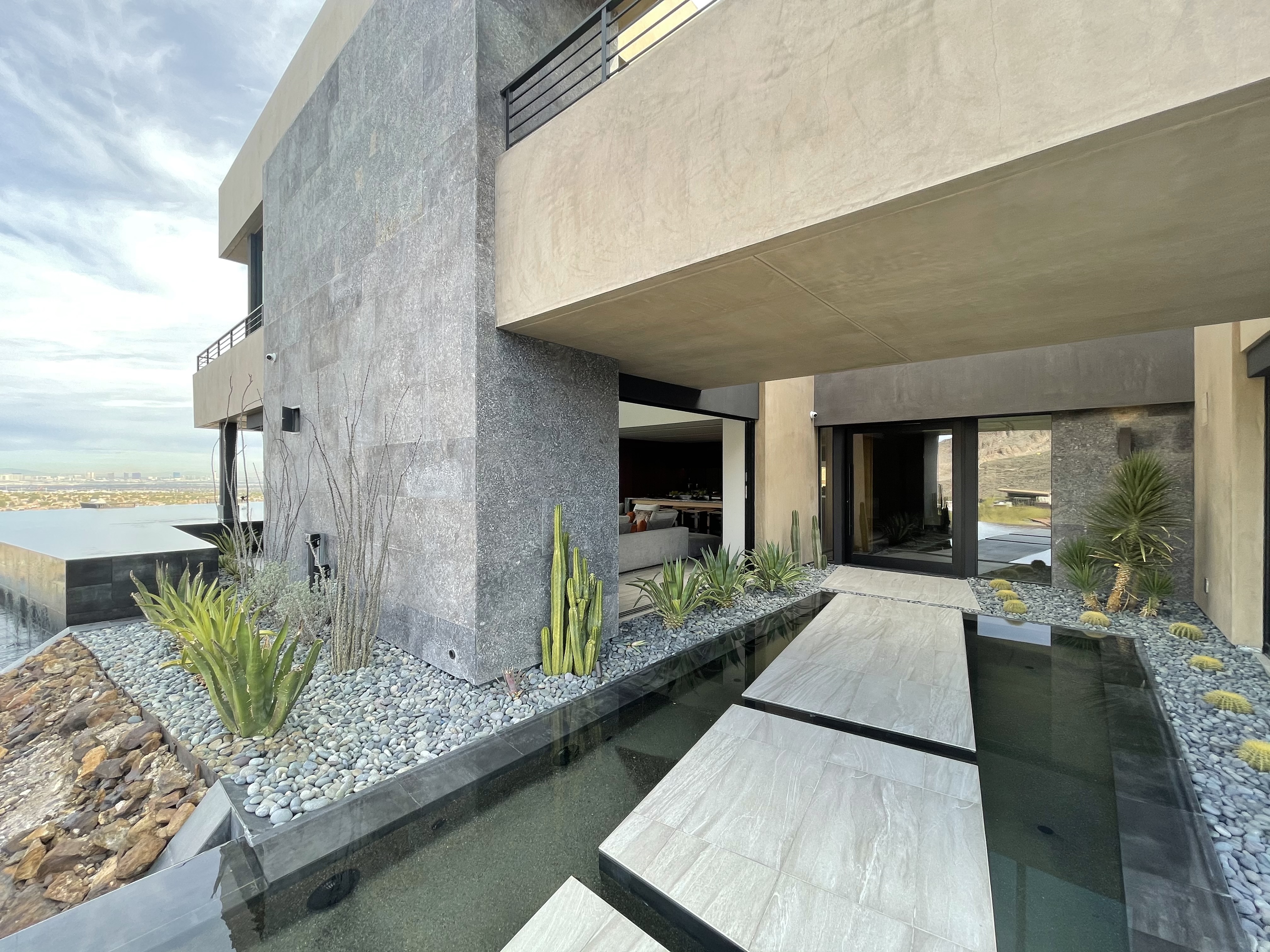 The variety of stone texture choices from bush hammer to leather as well as our combed material can be a choice for pool coping and pool decks as a thick paver or thin stone veneer to lay over concrete slabs depending on the situation using the same textures and sizes creating a monolithic look on your horizontal flooring surfaces. Taking the same material and using it for planters, lighting and speakers’ stone covers, wall caps, pony wall caps, or even custom-made stone waterfalls, fire pits and statues can also help fulfill your landscape design along the pool and its walkway.